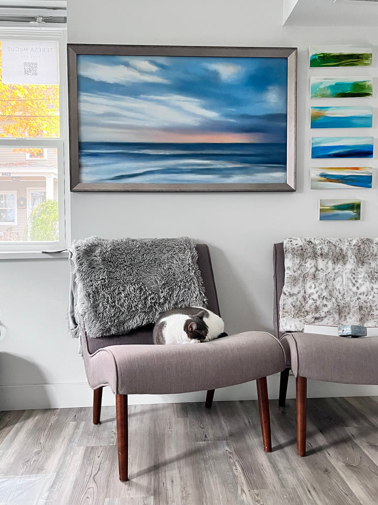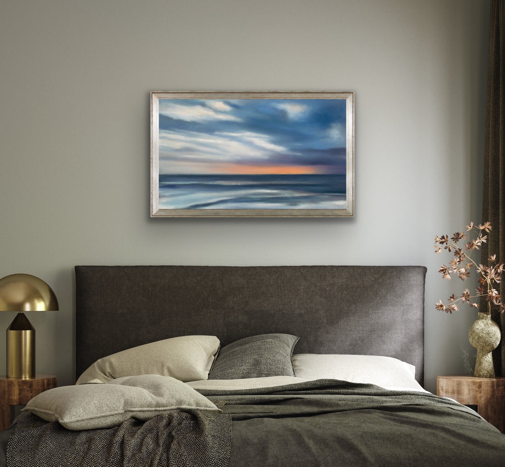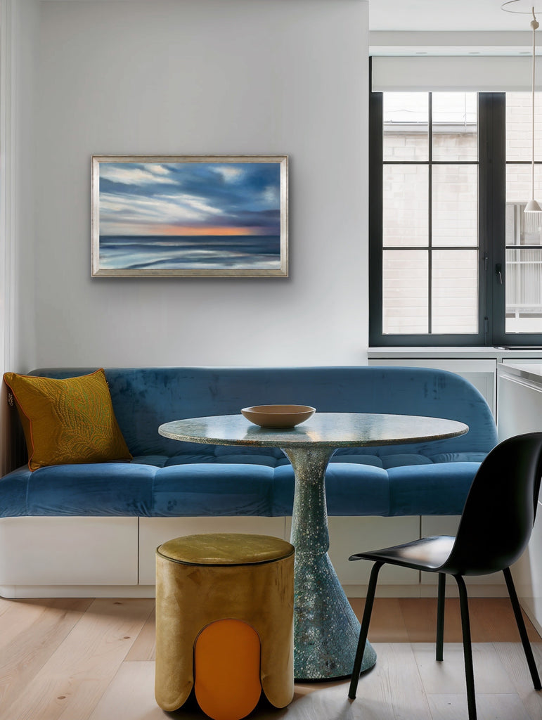 Daybreak 6 is a 24 x 40 pastel, celebrating that dramatic transition of night into day. In a contemporary frame, using museum glass, the overall dimension is 27 x 43 Perfect over a bed, sofa or in a dining area. Valued at $3800.